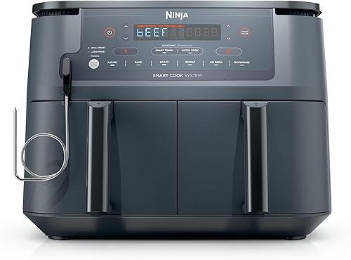 Ninja DZ550GY 10-Quart Air Fryer10-in-1 functions with smart thermometer, DualZone baskets, IQ Boost, 6 core programs (air fry, broil, roast, bake, reheat, dehydrate), keep warm option, 10-quart capacity, wide temp rangeCheck Price on Amazon
